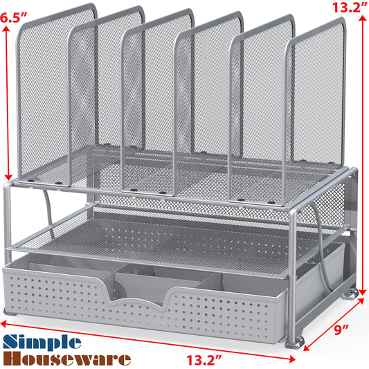 SimpleHouseware Mesh Desk Organizer with Sliding Drawer, Double Tray and 5 Upright Sections, Silver
