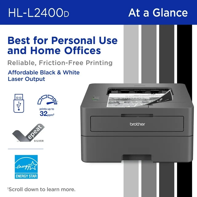 Designed for reliability, the HL-L2400D Compact Monochrome (Black & White) Laser Printer is a simple, affordable choice for black & white printing. Consistently producing crisp, easy-to-read black & white prints, as quick as it is efficient, it prints up to 32 pages per minute1 (ppm). The 250-sheet paper tray(2) reduces the frequency of paper refills, while automatic duplex printing saves time and decreases paper waste. This simple and straightforward personal laser printer connects to your device via Hi-speed USB 2.0 interface. Cost-effective and reliable, this printer is an efficient, time-saving addition to any home workspace.