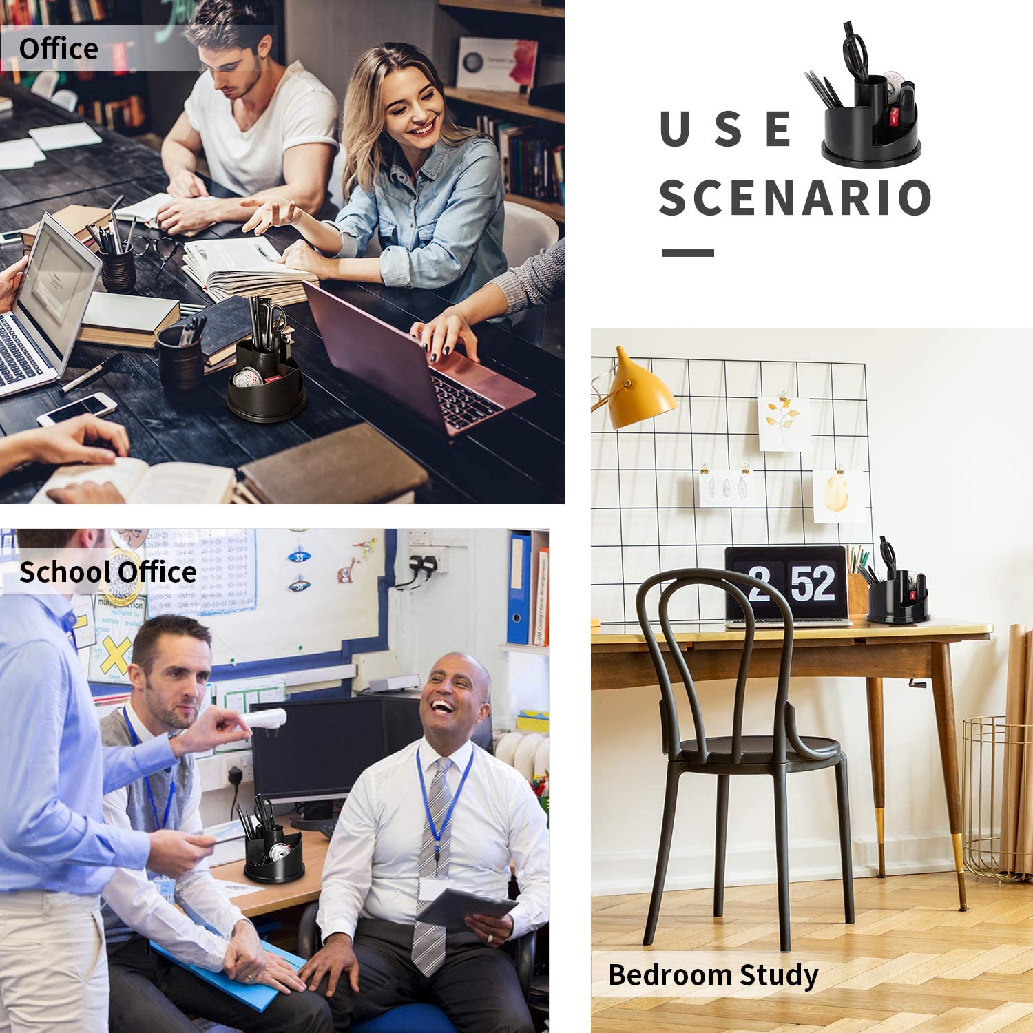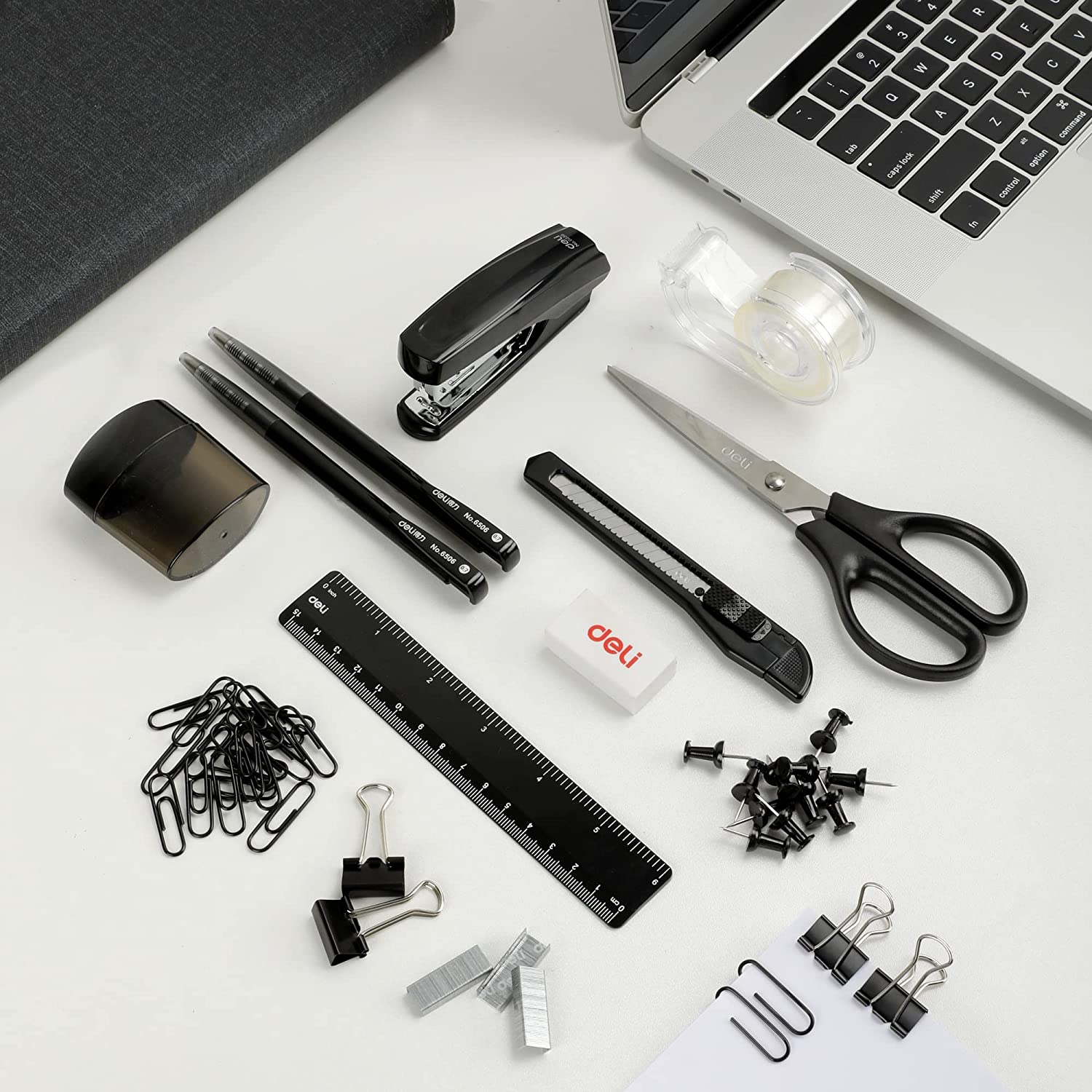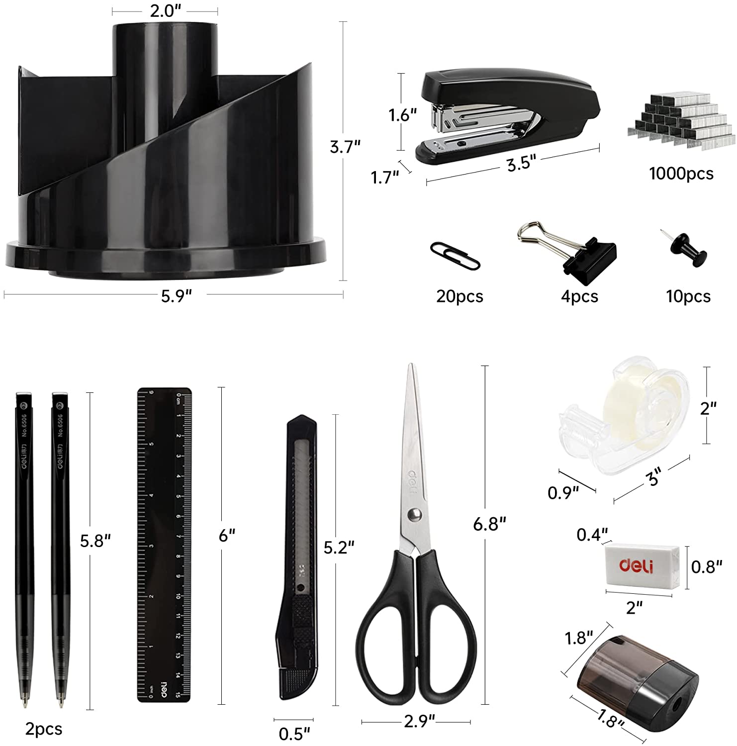 Amazing! Deli Office Supplies Set Value Pack is here! This Deli Office Supplies Set contains almost everything you need for the office or study, including 1 Desk Organizer, 1 Tape Dispenser, 1 Ruler, 2 HB Pencils, 10 Pushpins, 1 Stapler, 1 staple, 4 binders, 2 ballpoint pens, etc. High quality HIPS material, which is durable. The special round design of the organizer was designed is to maximize space. This desk organizer has 7 compartments to store pens, scissors, paper clips, solid glue, rulers and more. The rotating design allows you to easily access items. This practical and affordable set is hard to come by!