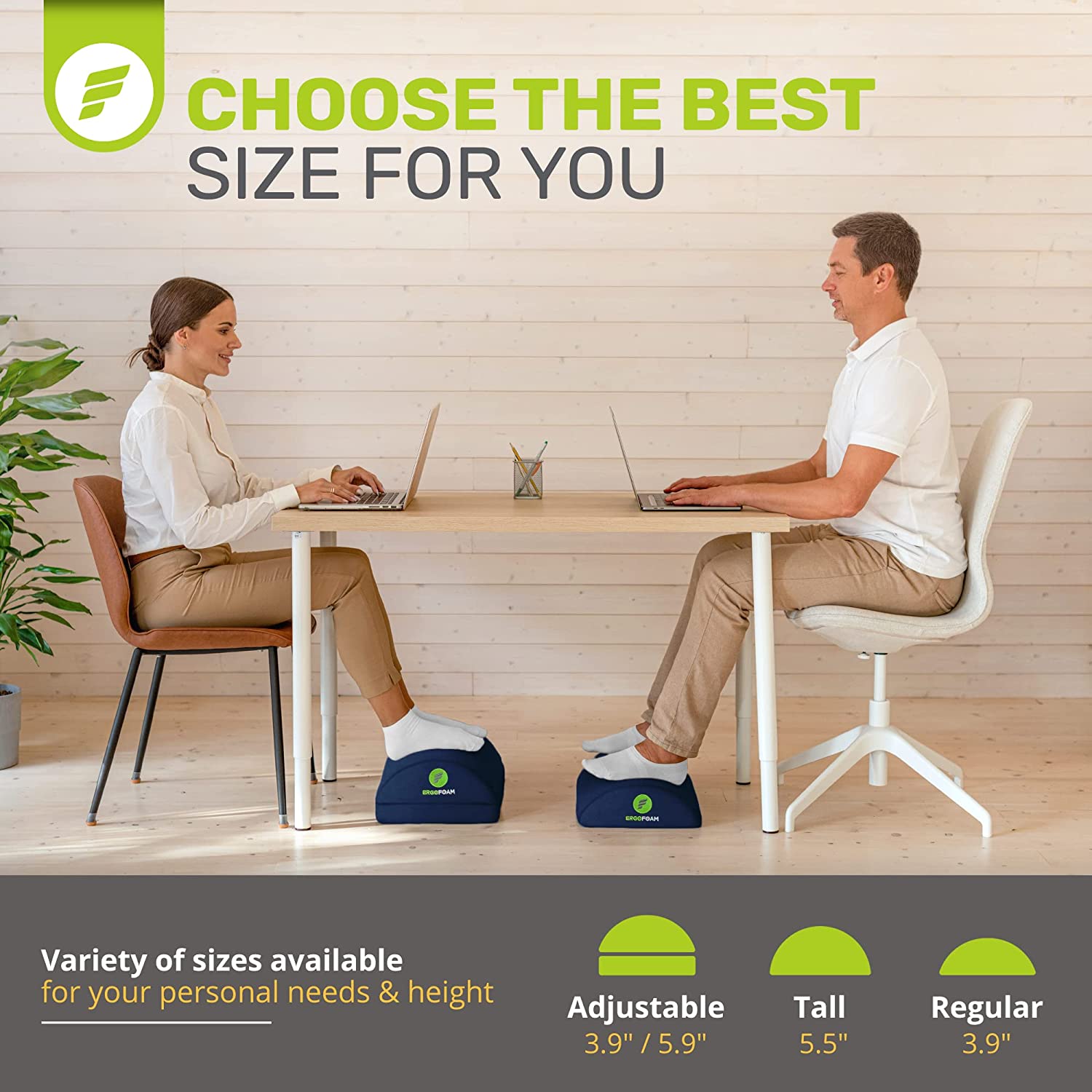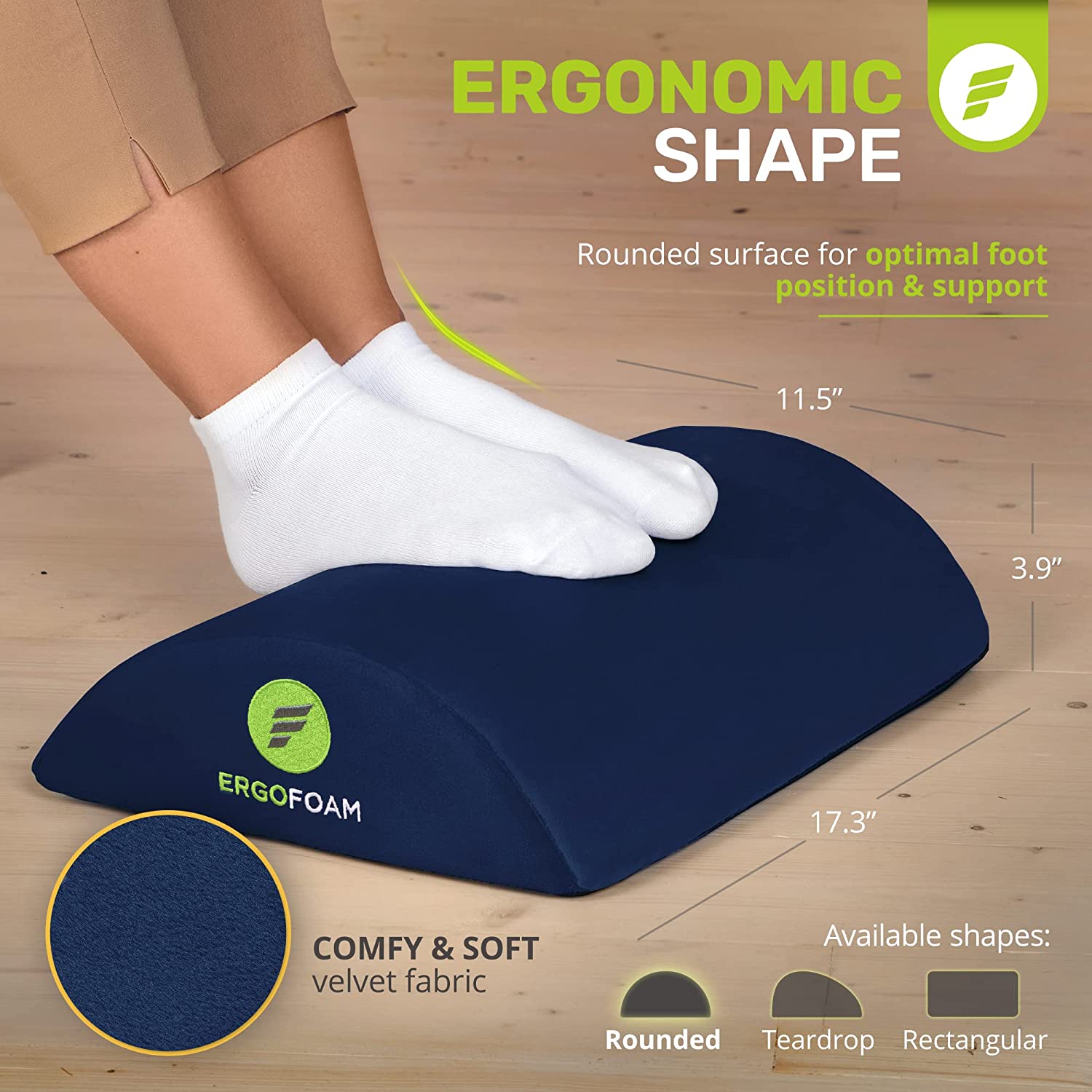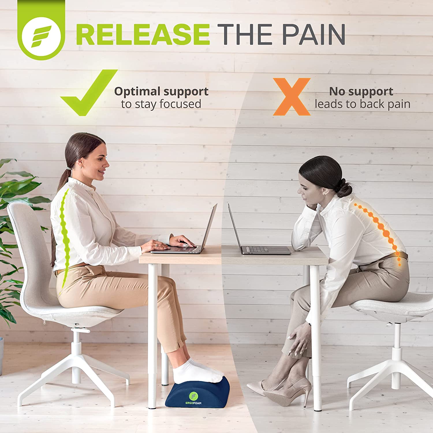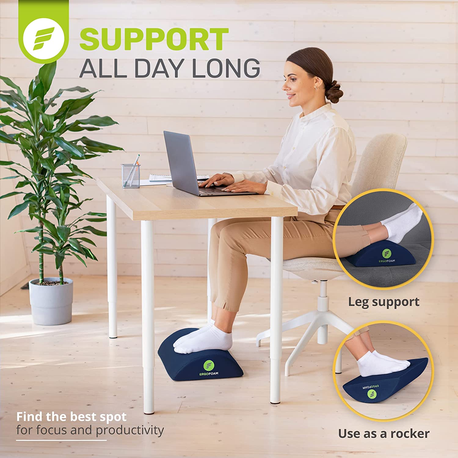 - Work From Home in Comfort - ErgoFoam's ergonomic desk foot rest provides firm support for your feet and helps ensure your sitting position is upright. Improving your posture has been proven to reduce soreness and fatigue to your back, feet, legs and knees, and will also improve circulation.
