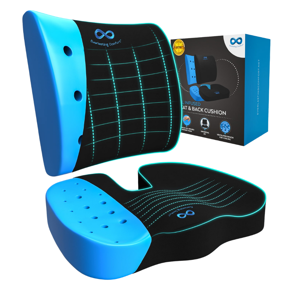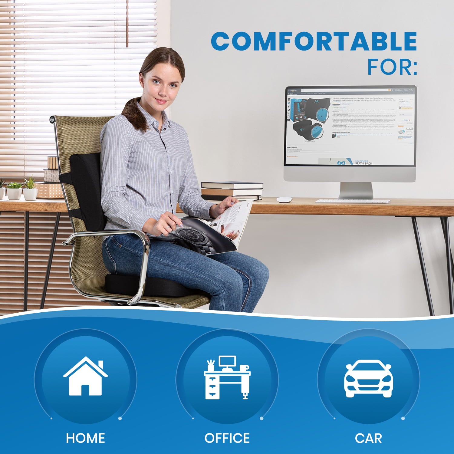 Sitting for long periods of time can lead to back pain, shoulder stiffness and tailbone discomfort. And sitting in uncomfortable chairs without support makes this problem worse. The Everlasting Comfort Seat Cushion and Back Cushion Combo Black provides optimal comfort during prolonged sitting periods by relieving pressure points such as your tailbone, hips, lower back and upper thighs - providing relief from aches associated with long hours spent seated. Made with 100% premium gel infused memory foam, it adapts to your body to provide personalized comfort. Added ventilation holes ensure your body heat is never trapped, allowing you to sit cool and comfortable. Fits any type of chair, these cushions will upgrade your seating experience.