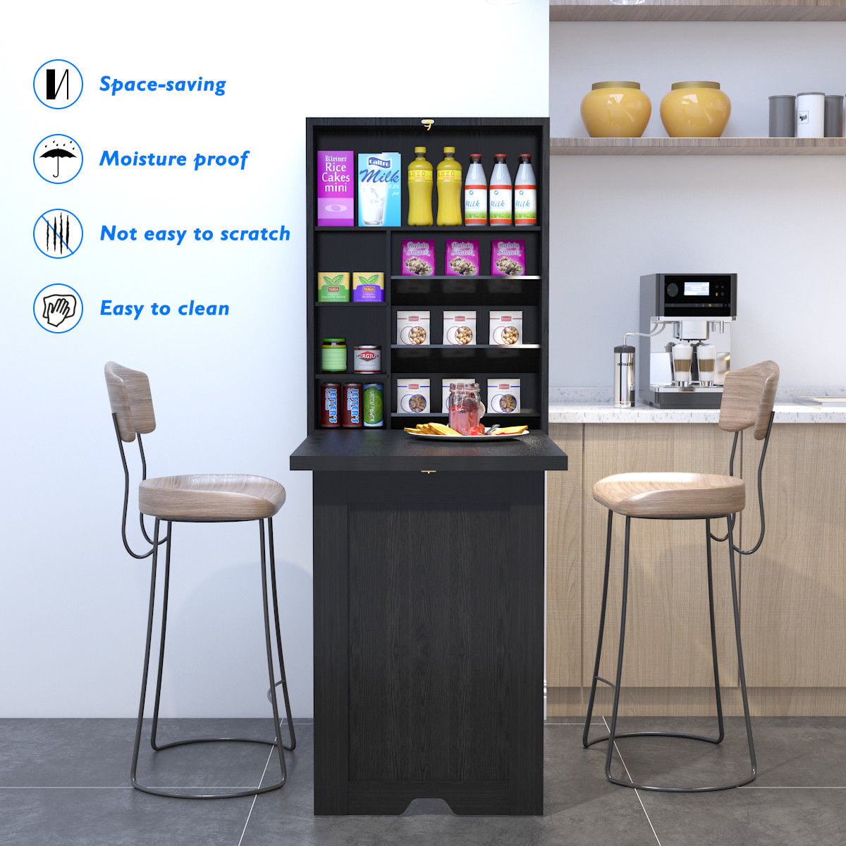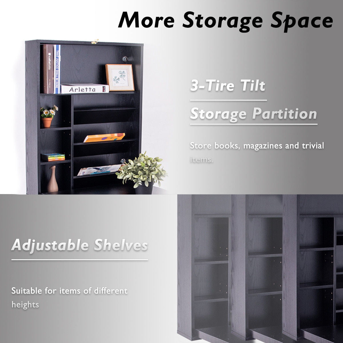 An ideal solution for any limited space area room, this painted black writing desk folds away neat and compact. Constructed of premium MDF, this desk is durable and sturdy. This desk provides ample storage for your to store your personal things, with two adjustable shelves for adapting to your changing requirements. Features wall mounted and foldable, our desk without taking up much space. Simple and stylish look adds an elegant feeling to your home, and can be combined with any decoration style. Our foldable desk is multi-function, not only can be a computer desk but also a cabinet. Don't hesitate to buy one!