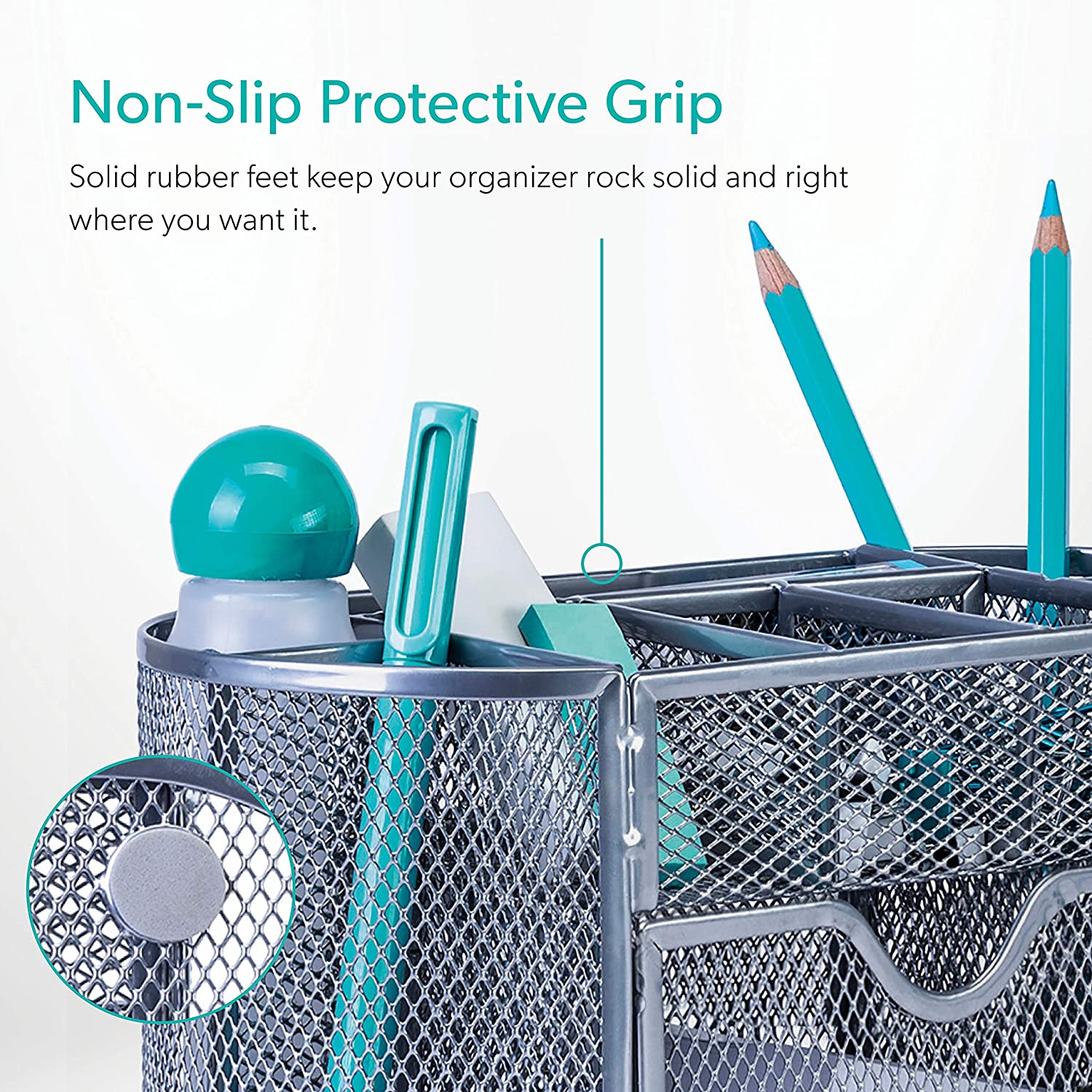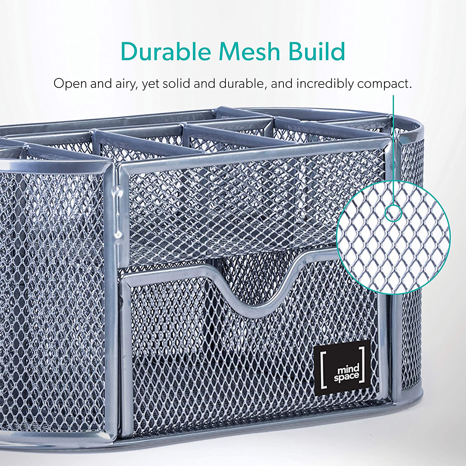 - ▶ LONG LASTING MATERIALS. Desk storage organizer made of durable, mesh metal and a solid base. Build to last with attention to details. Four soft rubber grips for extra protection. Pen desk organizer compartments let you separate pens, pencils, rulers and scissors. Shallow compartments hold clips and other small desk caddy supplies.