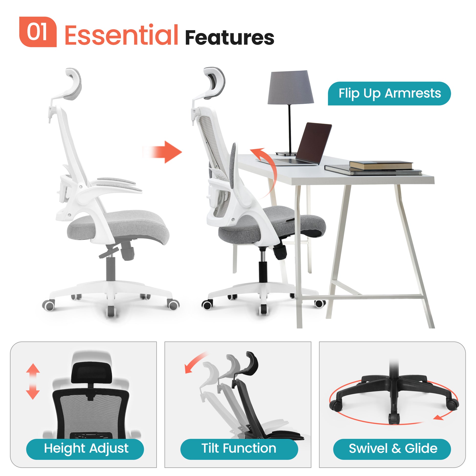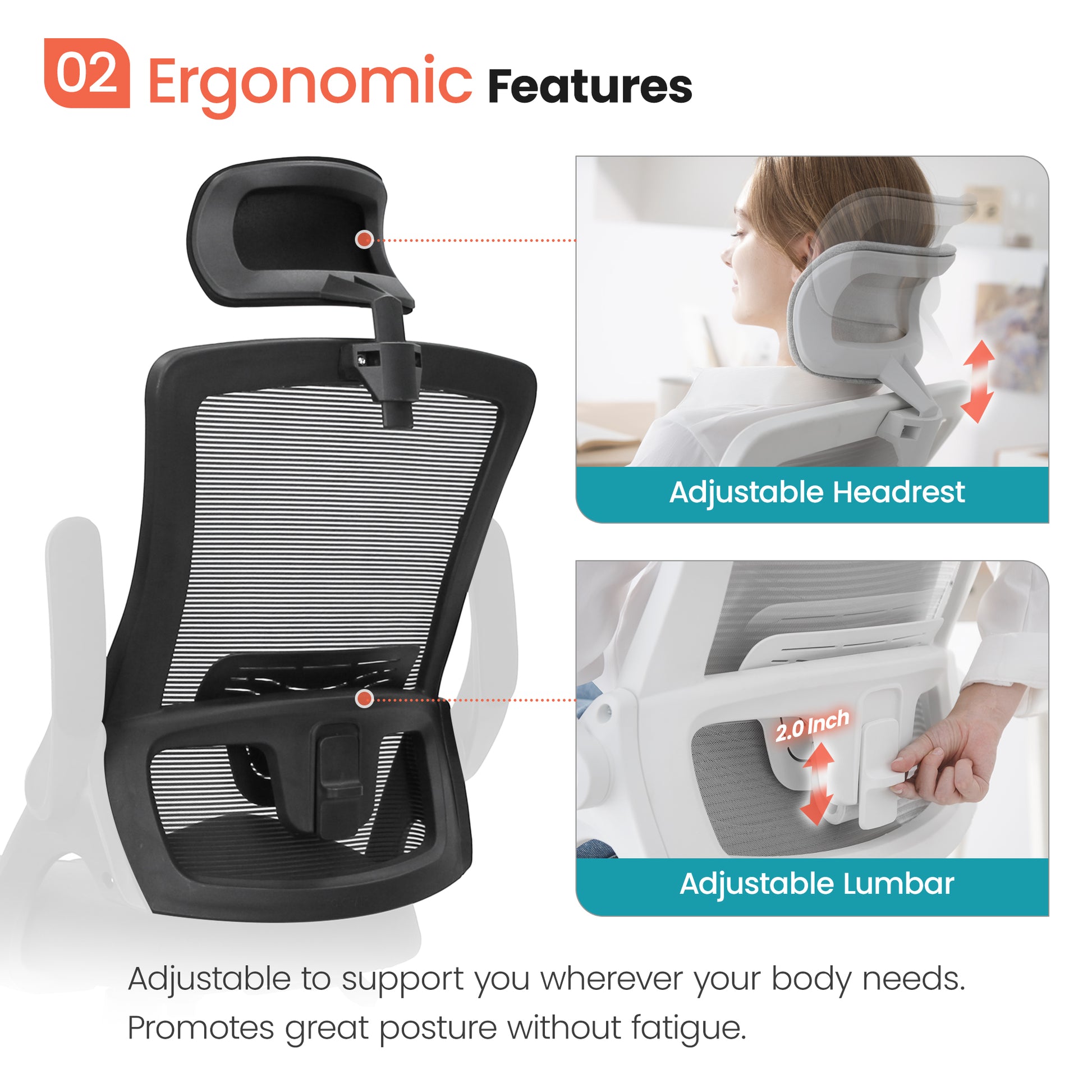 [2022 NEW LAUNCH] The perfect mesh chair with padded armrests that flip up for versatility. Meticulously developed to deliver maximum comfort and high quality. Designed for every space in mind. Back support is made of breathable woven mesh that hugs your lower back and promotes an ergonomic upright posture with an additional adjustable lumbar support. This well-balanced seat delivers reliable comfort all day long. Not too firm not too soft just right. Breeze through working gaming and focusing on your desk. Softly padded adjustable headrest provides reliable support to your head and neck so you can lean into relaxation at the comfort of your chair. Choose between two modes: Armrests UP: Sit more freely cross your legs or easily stow under your desk. Armrests DOWN: Rest your arms on the soft padded armrests for extra support while you focus.