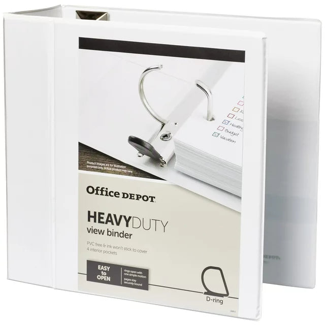 Ensure your paper work is organized and protected with this Office Depot heavy-duty D-ring binder. Compatibility with standard three-hole punched pages makes it easy to gather your papers for storage, while the binder board construction delivers durability to handle the workday or multiple classes. Featuring nonstick polypropylene covers, this Office Depot heavy-duty D-ring binder resists ink transfer to keep your writing clear and readable. Nonstick polypropylene covers resist ink transfer. Heavy-duty binder boards add strength and durability. Office Depot heavy-duty binders’ wide front and back binder panels fully cover divider tabs and sheet protectors. 4 clear interior pockets provide space to stash loose sheets of paper. Cover board made from 100% recycled fiber with at least 80% post-consumer fiber. 5" holds 1050 sheets 5" binders have locking rings Contains Recycled Content - See Specs for Details