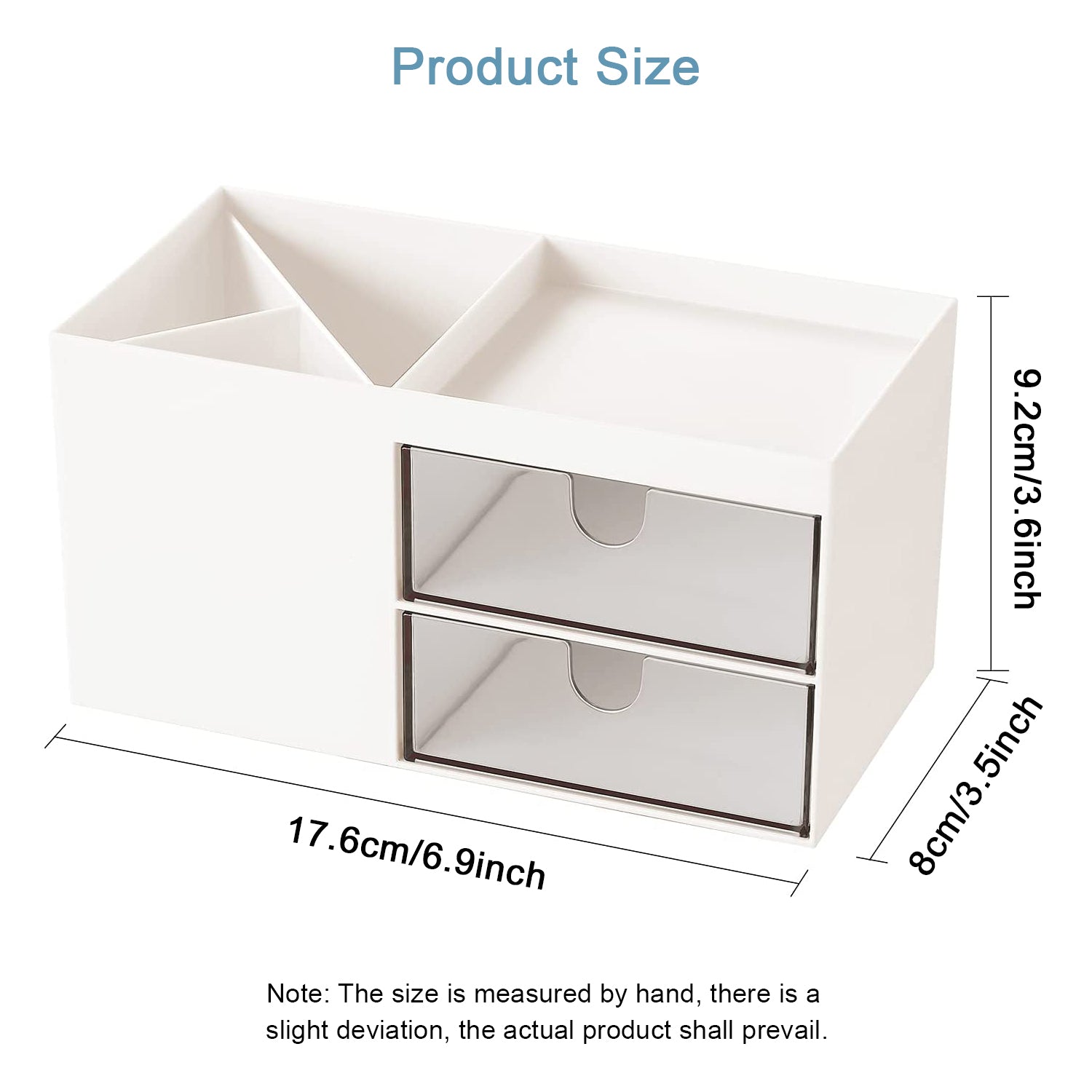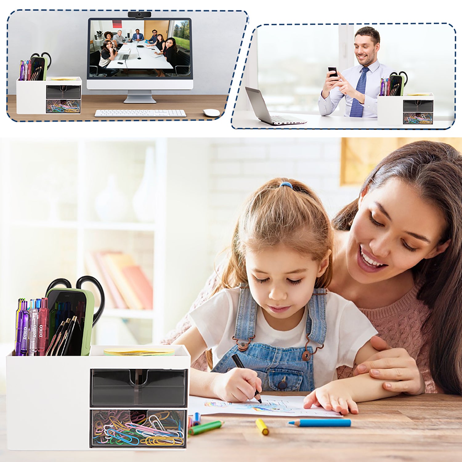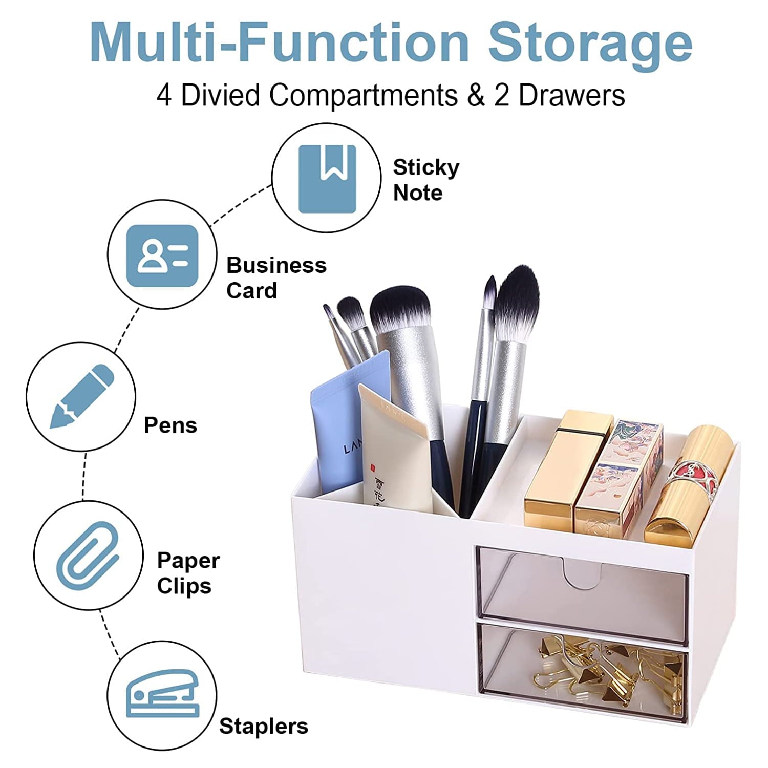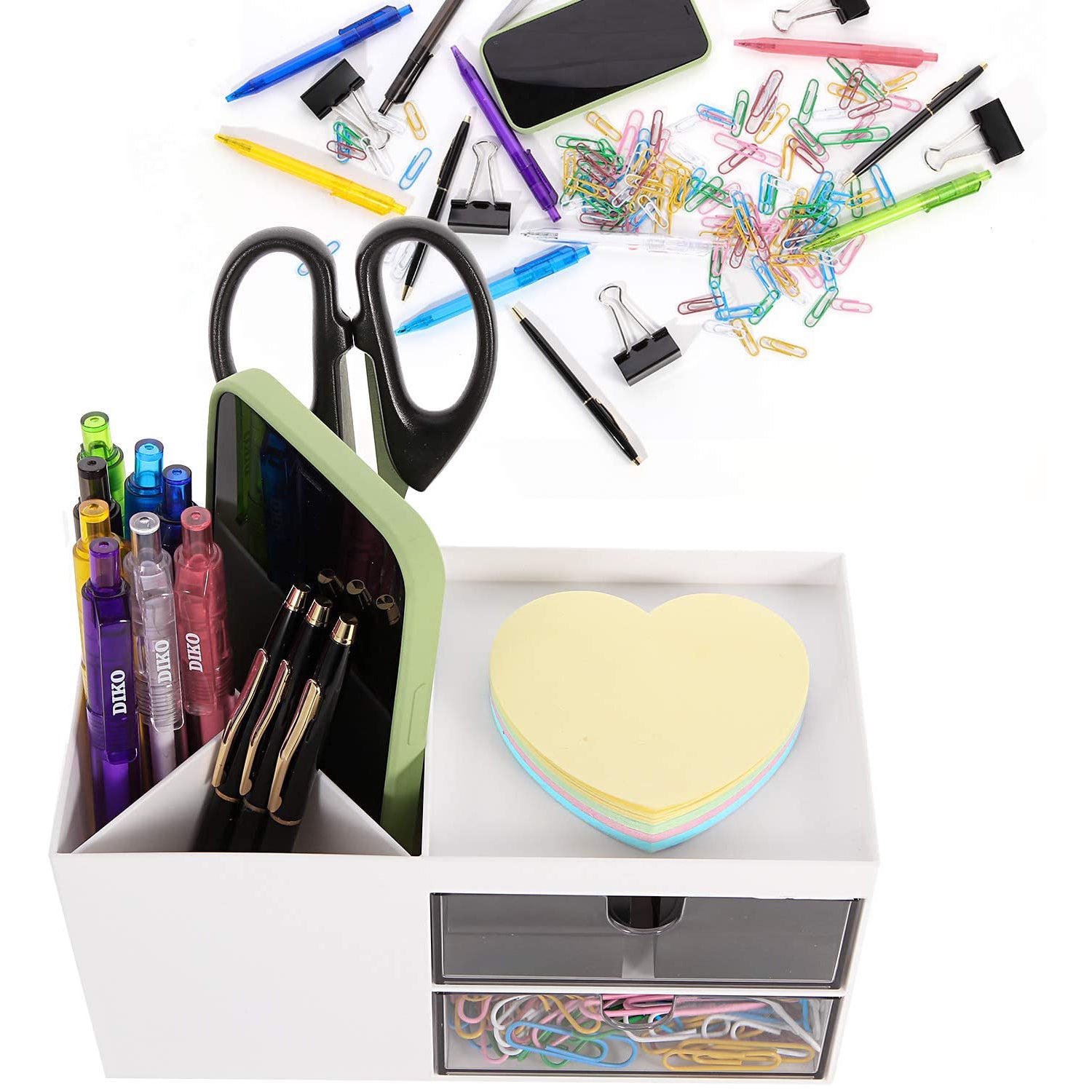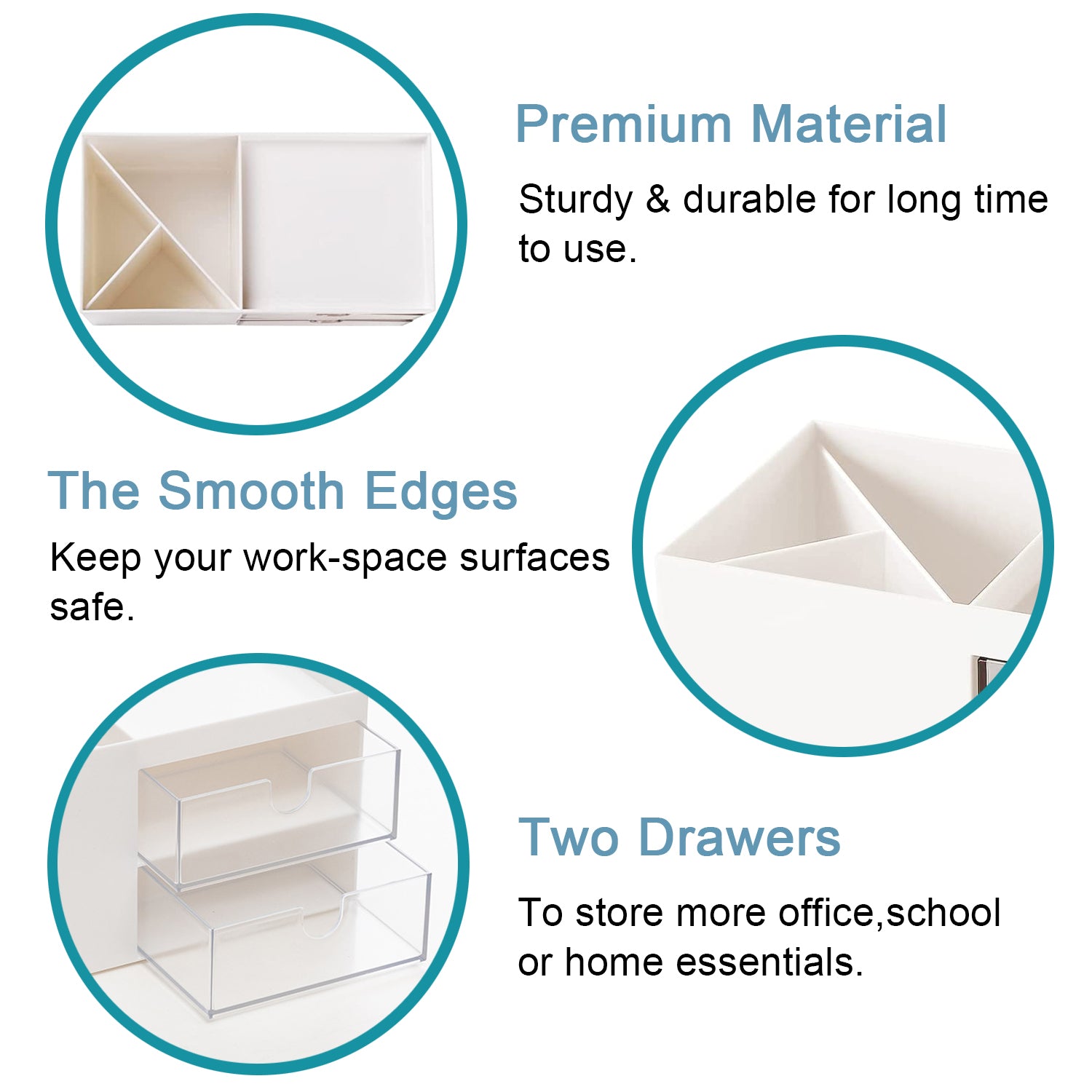 WQFSTORE Office Desk Organizer with drawer has 6 divided compartments to organize all your office supplies, and Desk Accessories, Business Card/Pen/Pencil/Mobile Phone. The pen holder with two small-notched supply drawers easy to pull out. this pen holder leaves a small footprint. Place it without it taking up too much surface. For all men, women, teachers, girls, boys, and children. A great pencil storage cup that can even be used as a makeup brush holder for girls.