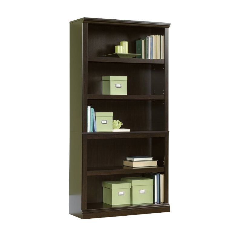 Add some stylish functionality to your home with this 5-shelf bookcase from the Sauder Select collection. With five total shelves, you can stack, store, and display all your books, knick-knacks, magazines, candles, bins, and your collection of DVDs and CDs. Three adjustable shelves allow you to customize this living room bookshelf to your specific needs. These spacious shelves also make a great place to display decorative items like framed photos of your family, your awards, and scrapbooks. Putting together this 5-shelf bookshelf is a breeze with patented slide-on moldings that allow for quick and easy assembly. Its attractive good looks and versatile design make this storage bookcase the perfect fit for any room in your home. Finished in a sleek Jamocha Wood®, this display bookcase is the perfect addition for any room: the dining room, office, living room, bedroom, or guest room.