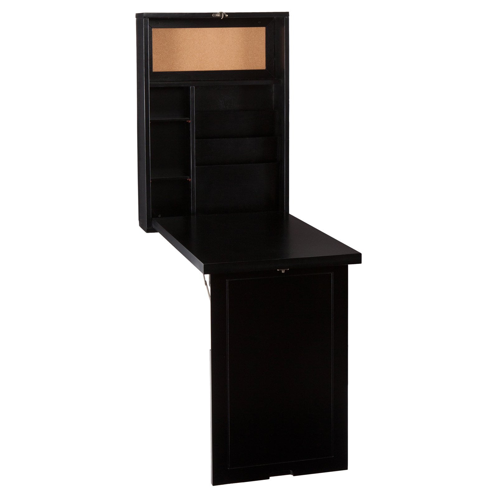 An ingenious solution for the home without a dedicated office, the Southern Enterprises Wall Mounted Fold Out Convertible Desk - Black transforms any room into an office one minute and hides completely away the next. Simply fold down the front of the cabinet to create a broad desk space for writing or laptop work. Inside, you'll find a top shelf, two adjustable shelves, and three folder-sized bill organizers that'll keep your office neat. Crafted from birch veneer and MDF in a black painted finish, this amazing writing desk helps you get your work done but leaves no trace.