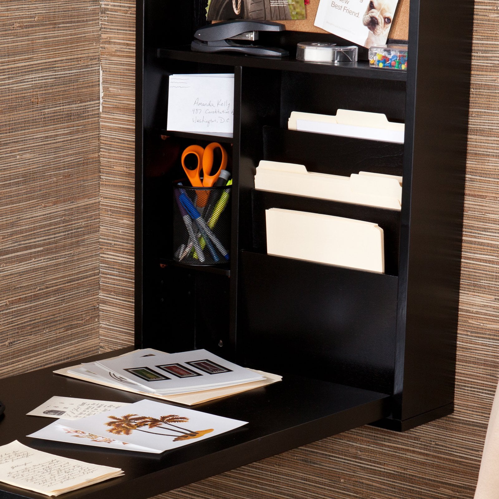 - Desk flips out from an attractive wall box