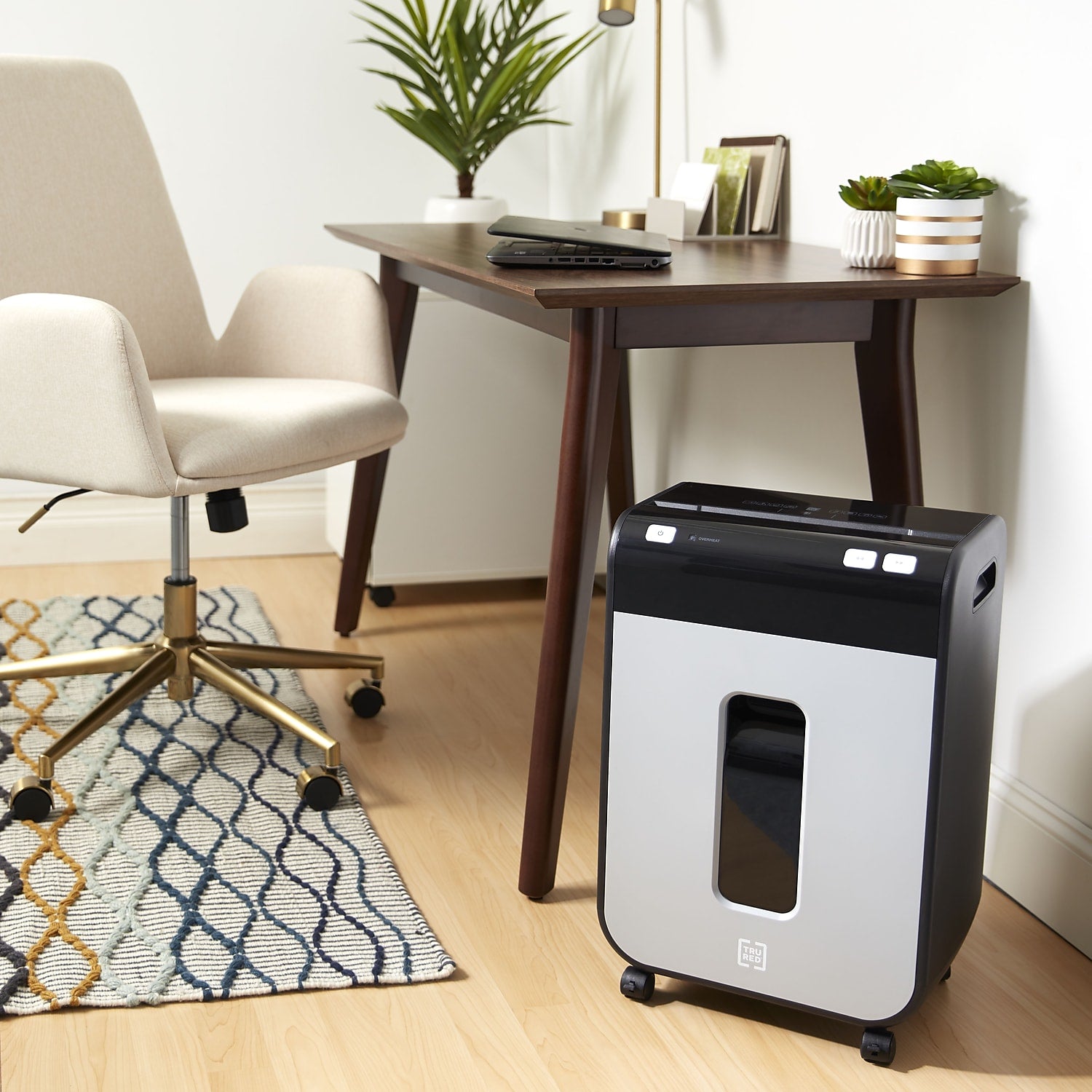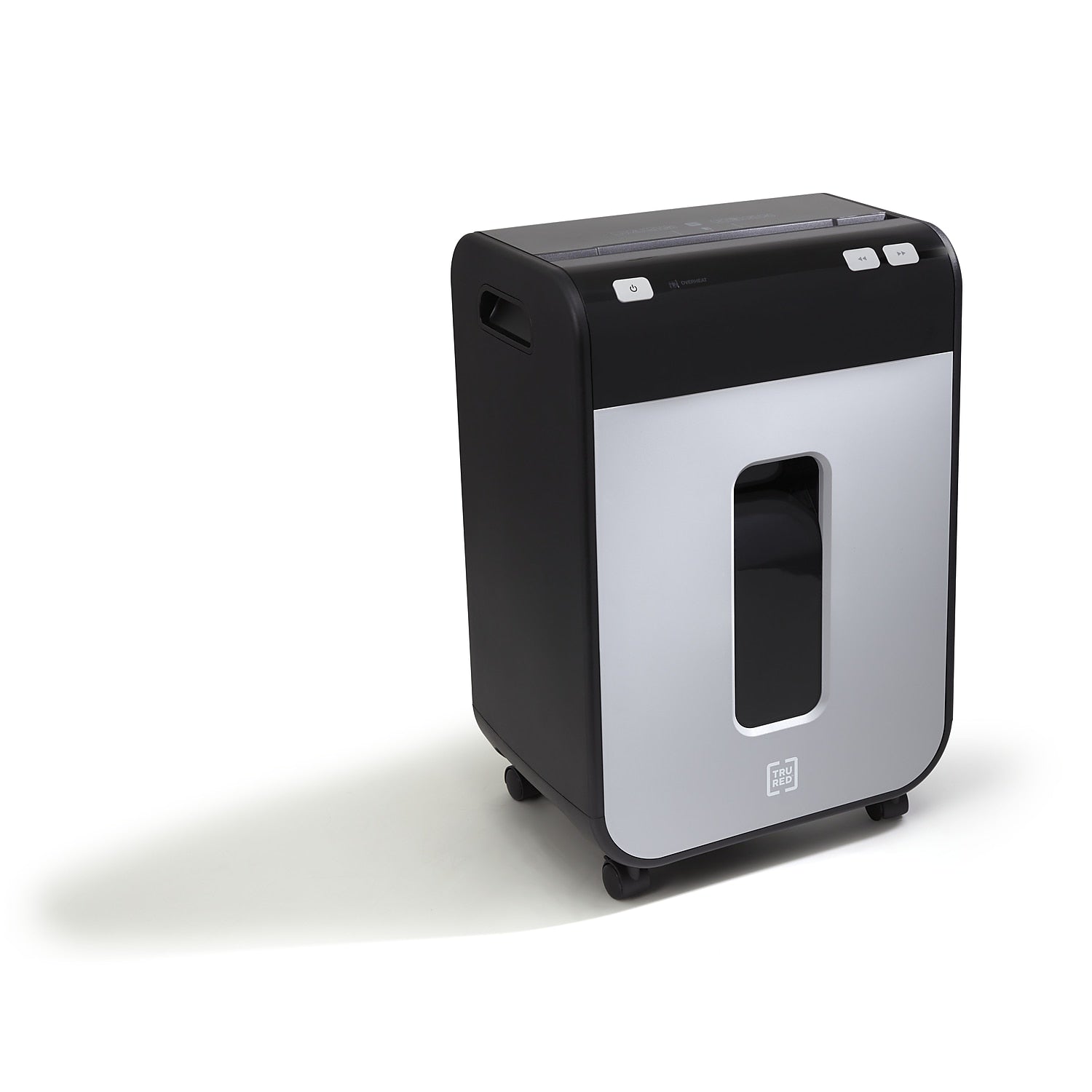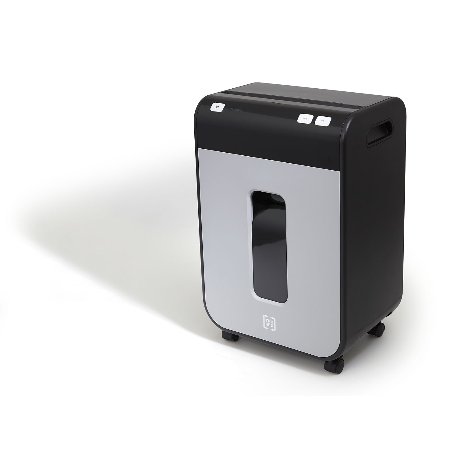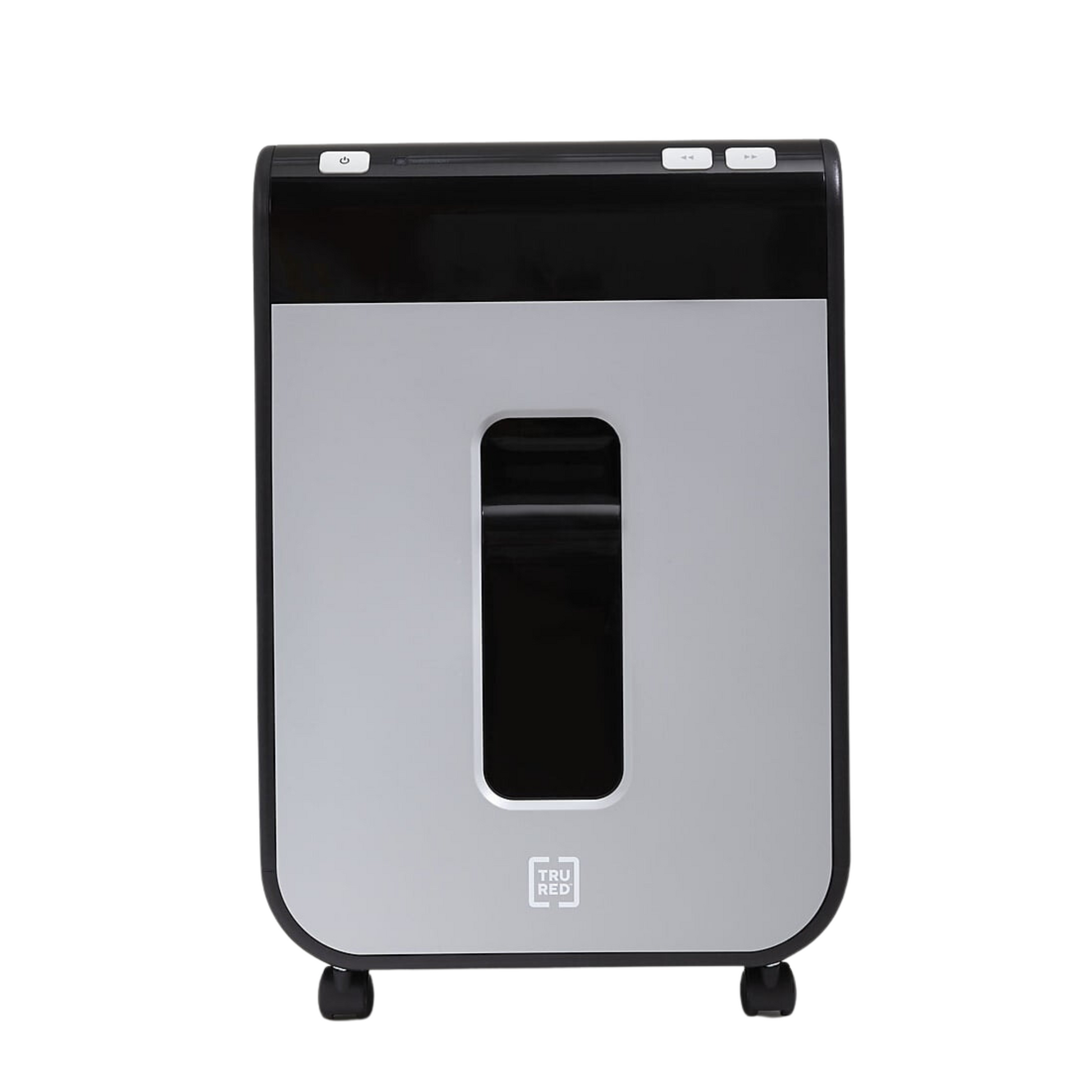 TRU RED™ 10-sheet micro-cut shredder reduces a standard letter sheet to up to 1200 particles.Dispose of unneeded documents with this TRU RED™ 10-Sheet Micro-Cut Commercial Shredder. Built with the demands of today's offices in mind, this shredder features built in handles and dual casters for mobility, letting you position it where the task is at hand. Micro-cut blades reduce media to 4mm x 12mm particles keeping discarded data safe and secure. Perfect for smaller size projects or day to day needs, this TRU RED™ shredder handles the task. The Micro-cut takes your data down to 4mm x 12mm particles (up to 1200 per letter size sheet). Provides complete shredding for: credit cards, staples, and paper. P-4 Rating provides increased sensitive data security for financial, personal, and confidential information. Dimensions: 21.2"H x 14.3"W x 10"D. 5-minute continuous run time with a 60-minute cool down between cycles. Black/gray pull-out bin with 5.8 gal. capacity for easy emptying and disposal of shredded content alone or with Shredder Bags (sold separately). Interlocking Bin prevents operation of shredder if bin is not fully engaged. Essential safety features such as Anti-Jam, Auto Start-Stop, Auto-Reverse, and Overload protect the user as well as the shredder. Dual casters make shredder easy to move and lock once in place. 1-year limited warranty. WARNING: This product can expose you to chemicals including lead, which is known to the State of California to cause cancer and birth defects or other reproductive harm. For more information go to www.P65Warnings.ca.gov.Product Instructions. Sold as 1 Each.
