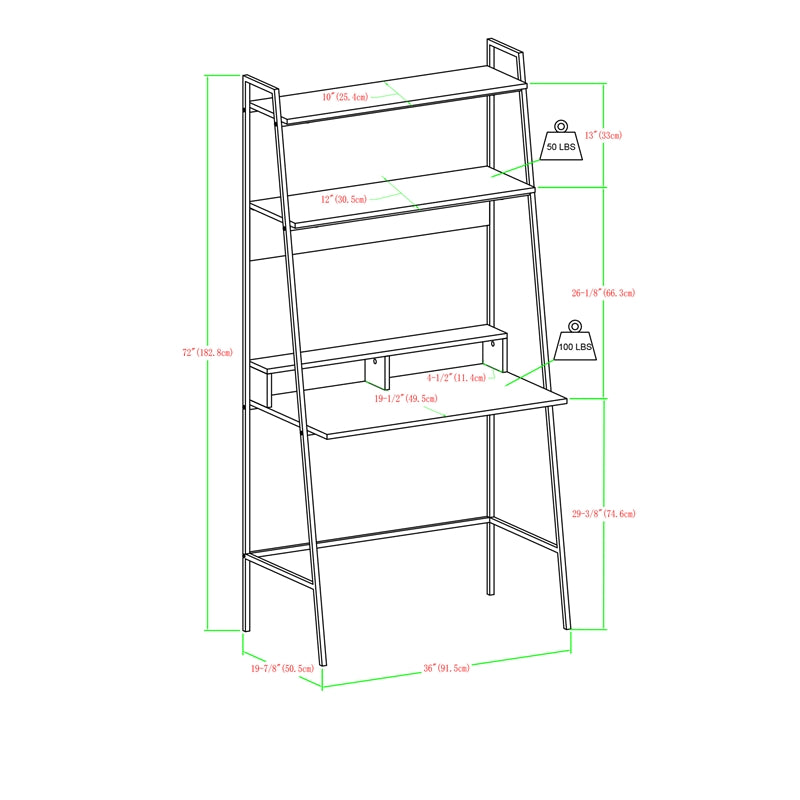 Designed of metal, high-grade MDF, and durable laminate , Desk includes magnet board for hanging photos and your calendar, The shelves provide additional storage space in your home for books, media, and decor , Includes: Ladder computer desk and two ladder bookcases, Dimensions: Desk: 36 (L) x 20 (W) x 72 (H) (44 LBS); Bookcase: 28 (L) x 18 (W) x 72 (H) (43 LBS)
